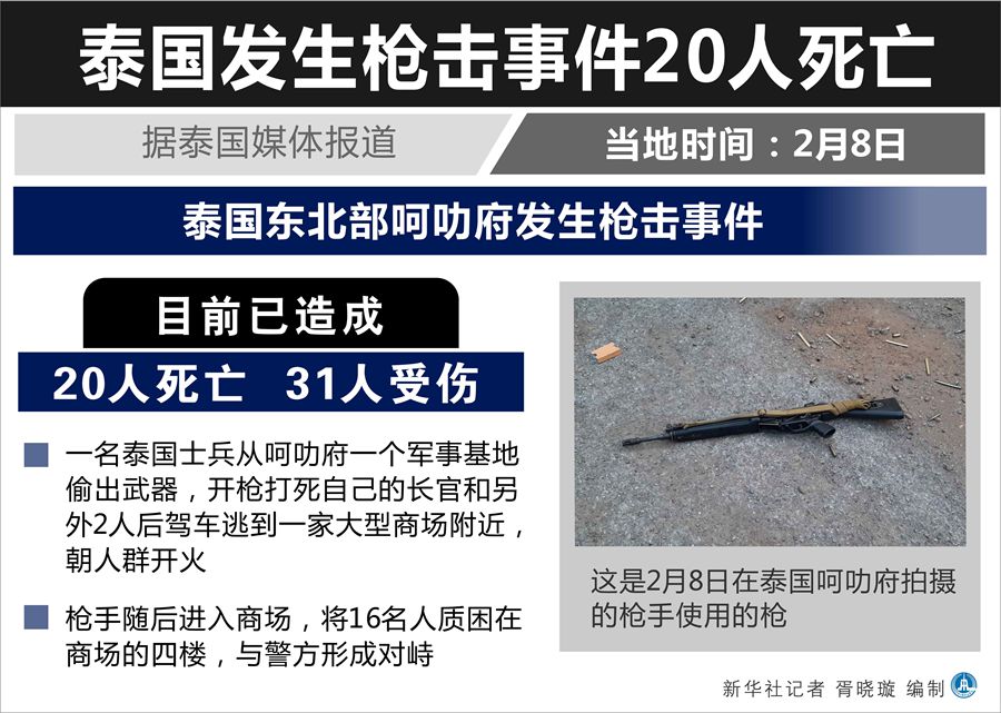新華社曼谷2月8日電(記者汪瑾 任芊)據(jù)泰國媒體報道,泰國東北部呵叻府8日發(fā)生槍擊事件,目前已造成20人死亡、31人受傷。泰國特種部隊進入槍手藏身的商場,商場內(nèi)大批民眾被疏散,但槍手目前所處位置尚不清楚。