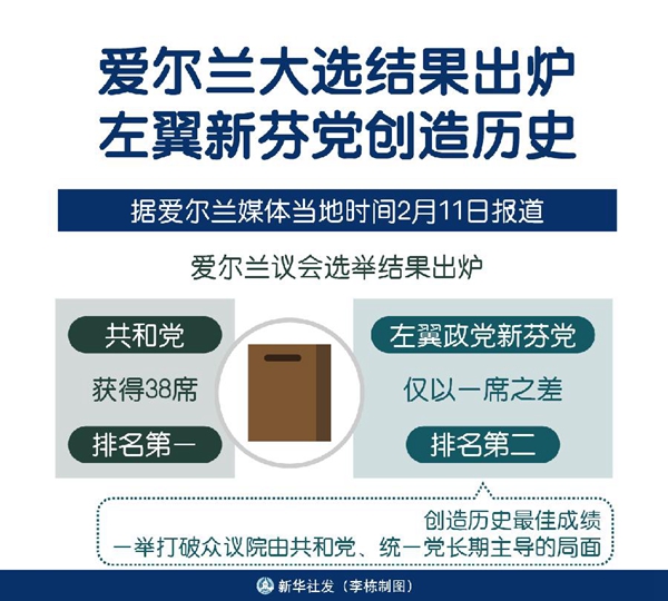 新華社都柏林2月11日電(記者張琪)據(jù)愛(ài)爾蘭媒體11日?qǐng)?bào)道,愛(ài)爾蘭議會(huì)選舉結(jié)果出爐:共和黨獲得38席,排名第一;左翼政黨新芬黨僅以一席之差排名第二,創(chuàng)造歷史最佳成績(jī),一舉打破眾議院由共和黨、統(tǒng)一黨長(zhǎng)期主導(dǎo)的局面。