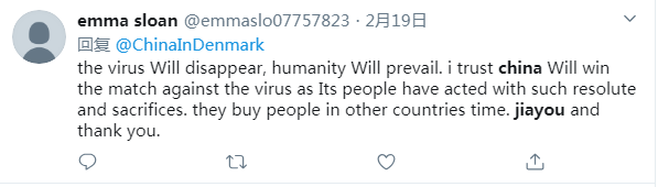 推特用戶emma sloan說:病毒將會(huì)消失,人類將會(huì)獲勝。我相信中國(guó)將會(huì)打敗病毒,因?yàn)橹袊?guó)人民采取了堅(jiān)決且富有犧牲精神的行動(dòng)。他們給其他國(guó)家的人民爭(zhēng)取了時(shí)間。加油,謝謝你們。