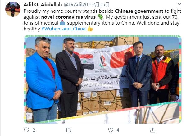 推特用戶Adil O. Abdullah說:我的祖國(guó)支持中國(guó)政府抗擊新冠肺炎病毒,我為此感到驕傲。我們的政府向中國(guó)送去了70噸的醫(yī)療補(bǔ)給物資,干得不錯(cuò)。武漢和全中國(guó)都要平安康泰。