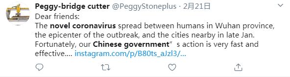 推特用戶Peggy-bridge cutter說:親愛的朋友們,新冠肺炎疫情在武漢和周邊城市暴發(fā)。所幸,中國(guó)政府采取了迅速、有效的行動(dòng)。