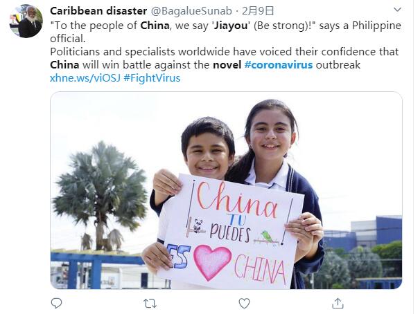 推特用戶Caribbean disaster說:一名菲律賓官員表示,想要對(duì)中國(guó)人民說,你們加油。世界各地的政治家和專家紛紛表示,對(duì)中國(guó)戰(zhàn)勝新冠疫情很有信心。(作者: 嚴(yán)玉潔 資料來源:新華社、央視網(wǎng)、人民網(wǎng)、國(guó)際在線等)