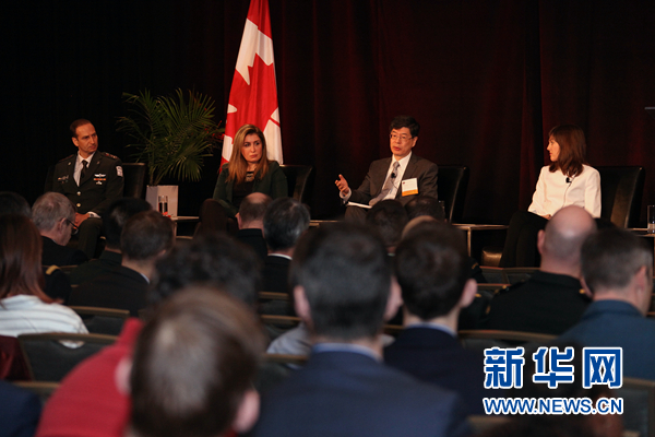圖為中國(guó)駐加拿大大使叢培武(右二)在渥太華安全與防務(wù)會(huì)議上回答問(wèn)題。記者李保東 攝