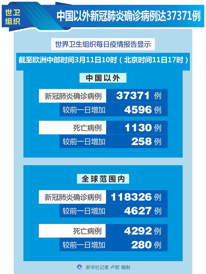 世衛(wèi)組織每日疫情報(bào)告顯示,截至歐洲中部時(shí)間11日10時(shí)(北京時(shí)間11日17時(shí)),中國以外新冠肺炎確診病例較前一日增加4596例,達(dá)到37371例;中國以外死亡病例較前一日增加258例,達(dá)到1130例。