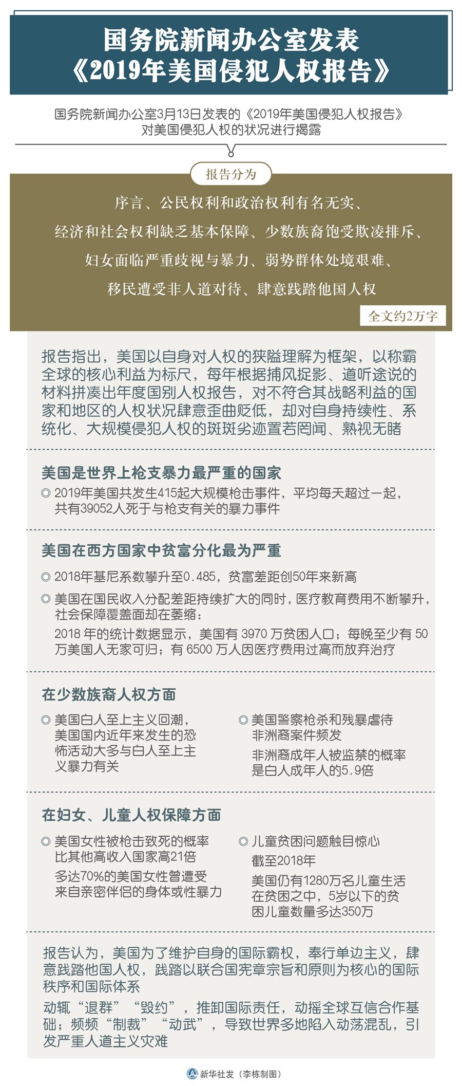 新華社北京3月13日電(記者王子銘、張?jiān)讫垼﹪鴦?wù)院新聞辦公室13日發(fā)表《2019年美國侵犯人權(quán)報(bào)告》,對美國侵犯人權(quán)的狀況進(jìn)行揭露。