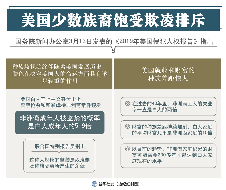 新華社北京3月13日電(記者王子銘、申安妮)國務院新聞辦13日發(fā)表的《2019年美國侵犯人權(quán)報告》指出,美國少數(shù)族裔飽受欺凌排斥。