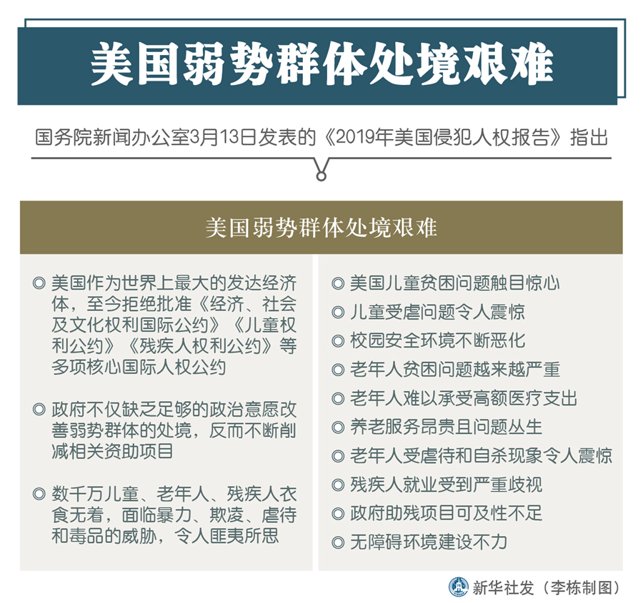 新華社北京3月13日電(記者王鵬、賈釗)國(guó)務(wù)院新聞辦13日發(fā)表的《2019年美國(guó)侵犯人權(quán)報(bào)告》指出,美國(guó)弱勢(shì)群體處境艱難。