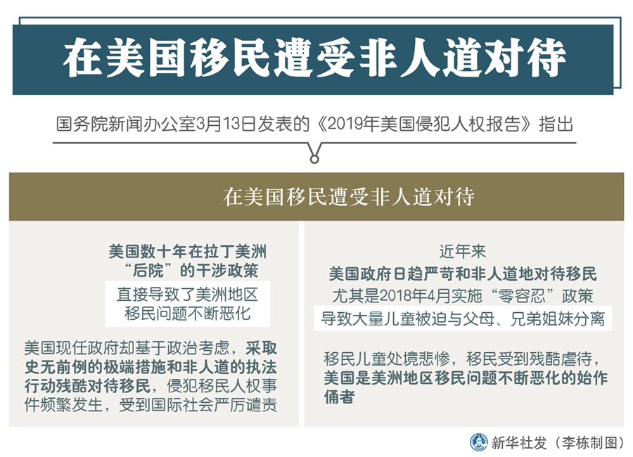 新華社北京3月13日電(記者王鵬、李超)國(guó)務(wù)院新聞辦13日發(fā)表的《2019年美國(guó)侵犯人權(quán)報(bào)告》指出,在美國(guó)移民遭受非人道對(duì)待。