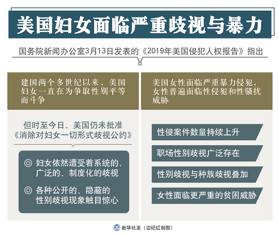 新華社北京3月13日電(記者王鵬、張?jiān)讫垼﹪?guó)務(wù)院新聞辦13日發(fā)表的《2019年美國(guó)侵犯人權(quán)報(bào)告》指出,美國(guó)婦女面臨嚴(yán)重歧視與暴力。