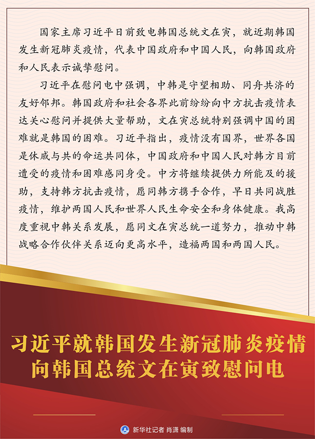 習(xí)近平在慰問電中強(qiáng)調(diào),中韓是守望相助、同舟共濟(jì)的友好鄰邦。韓國政府和社會(huì)各界此前紛紛向中方抗擊疫情表達(dá)關(guān)心慰問并提供大量幫助,文在寅總統(tǒng)特別強(qiáng)調(diào)中國的困難就是韓國的困難。習(xí)近平指出,疫情沒有國界,世界各國是休戚與共的命運(yùn)共同體,中國政府和中國人民對(duì)韓方目前遭受的疫情和困難感同身受。中方將繼續(xù)提供力所能及的援助,支持韓方抗擊疫情,愿同韓方攜手合作,早日共同戰(zhàn)勝疫情,維護(hù)兩國人民和世界人民生命安全和身體健康。我高度重視中韓關(guān)系發(fā)展,愿同文在寅總統(tǒng)一道努力,推動(dòng)中韓戰(zhàn)略合作伙伴關(guān)系邁向更高水平,造福兩國和兩國人民。