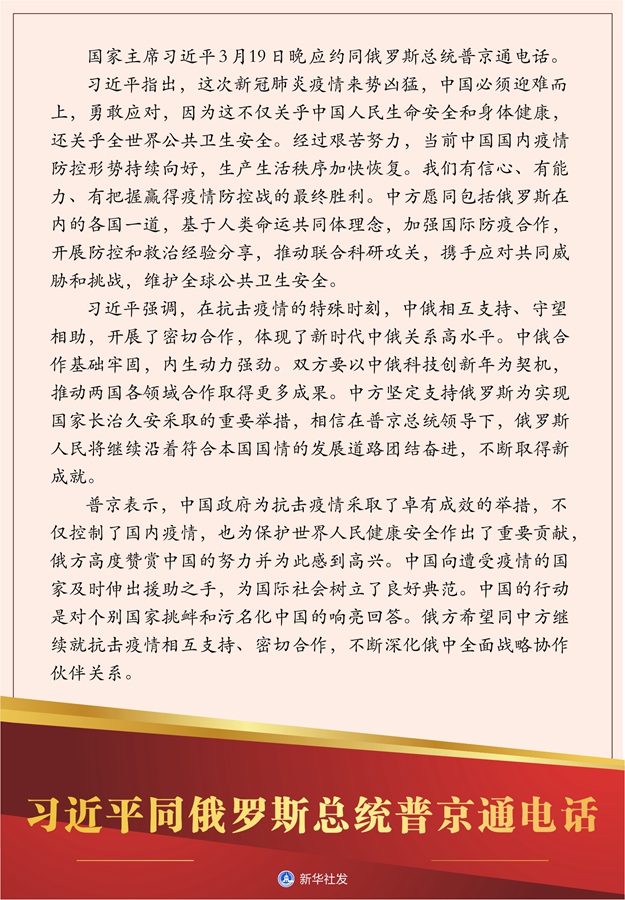 習(xí)近平指出,這次新冠肺炎疫情來勢兇猛,中國必須迎難而上,勇敢應(yīng)對,因為這不僅關(guān)乎中國人民生命安全和身體健康,還關(guān)乎全世界公共衛(wèi)生安全。經(jīng)過艱苦努力,當前中國國內(nèi)疫情防控形勢持續(xù)向好,生產(chǎn)生活秩序加快恢復(fù)。我們有信心、有能力、有把握贏得疫情防控戰(zhàn)的最終勝利。中方愿同包括俄羅斯在內(nèi)的各國一道,基于人類命運共同體理念,加強國際防疫合作,開展防控和救治經(jīng)驗分享,推動聯(lián)合科研攻關(guān),攜手應(yīng)對共同威脅和挑戰(zhàn),維護全球公共衛(wèi)生安全。