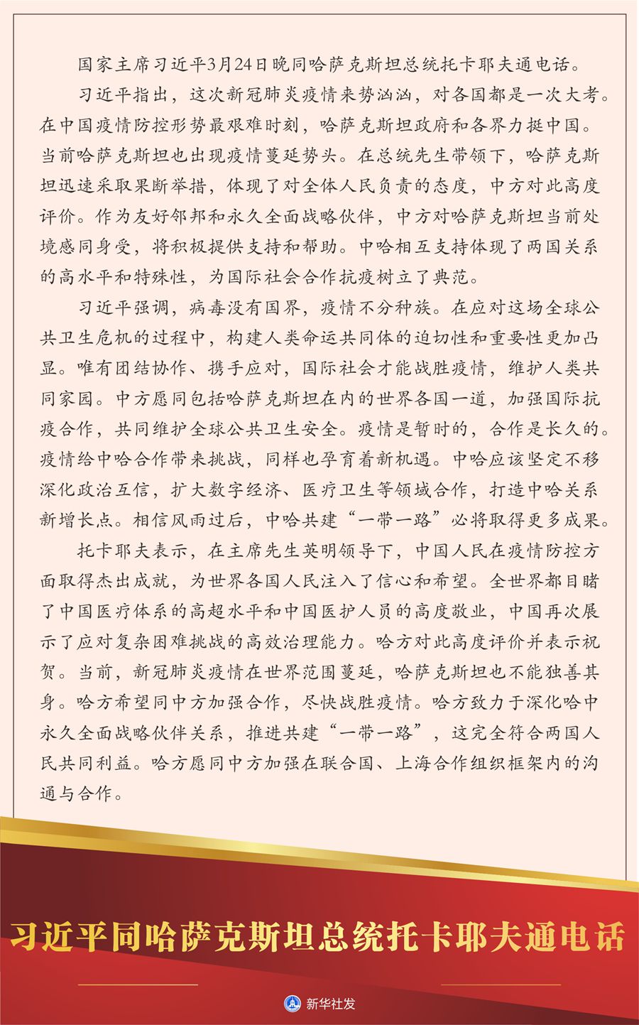 習(xí)近平指出,這次新冠肺炎疫情來勢洶洶,對(duì)各國都是一次大考。在中國疫情防控形勢最艱難時(shí)刻,哈薩克斯坦政府和各界力挺中國。當(dāng)前哈薩克斯坦也出現(xiàn)疫情蔓延勢頭。在總統(tǒng)先生帶領(lǐng)下,哈薩克斯坦迅速采取果斷舉措,體現(xiàn)了對(duì)全體人民負(fù)責(zé)的態(tài)度,中方對(duì)此高度評(píng)價(jià)。作為友好鄰邦和永久全面戰(zhàn)略伙伴,中方對(duì)哈薩克斯坦當(dāng)前處境感同身受,將積極提供支持和幫助。中哈相互支持體現(xiàn)了兩國關(guān)系的高水平和特殊性,為國際社會(huì)合作抗疫樹立了典范。