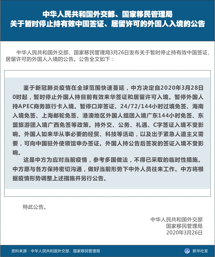 新華社北京3月26日電 中華人民共和國外交部、國家移民管理局26日發(fā)布關(guān)于暫時(shí)停止持有效中國簽證、居留許可的外國人入境的公告。公告全文如下: