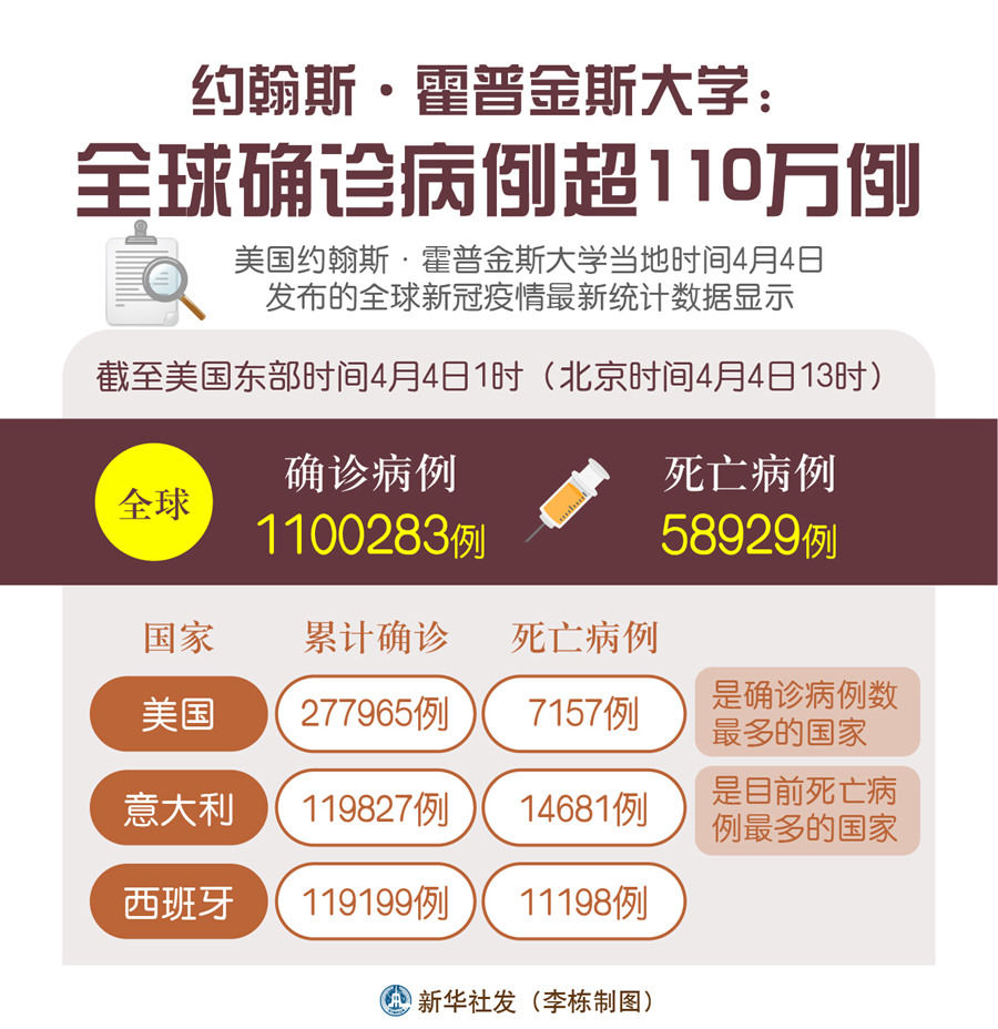 數(shù)據(jù)顯示,截至美國東部時間4日1時(北京時間4日13時),全球確診病例達1100283例,死亡病例為58929例。