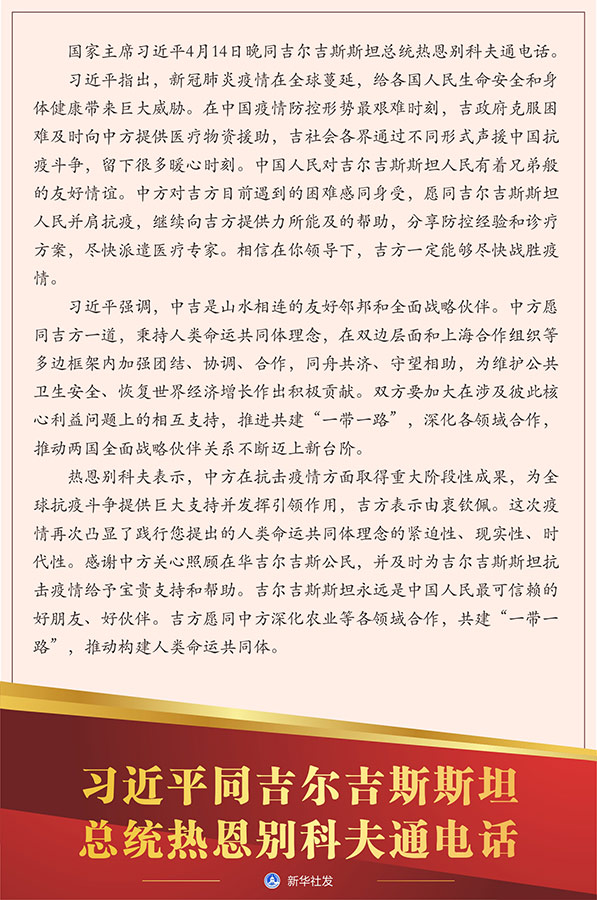 新華社北京4月14日電 國(guó)家主席習(xí)近平14日晚同吉爾吉斯斯坦總統(tǒng)熱恩別科夫通電話。