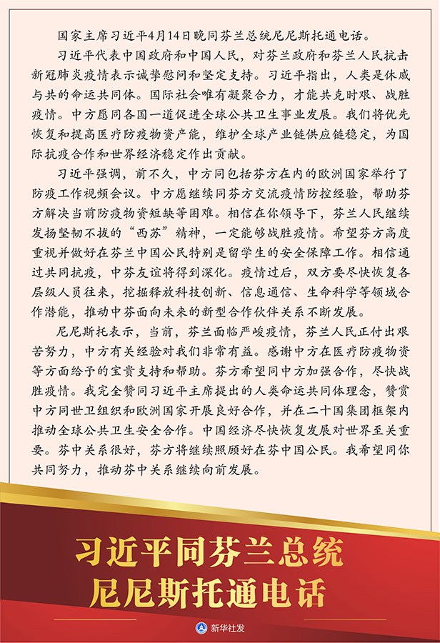 習近平強調,前不久,中方同包括芬方在內的歐洲國家舉行了防疫工作視頻會議。中方愿繼續(xù)同芬方交流疫情防控經驗,幫助芬方解決當前防疫物資短缺等困難。相信在你領導下,芬蘭人民繼續(xù)發(fā)揚堅韌不拔的“西蘇”精神,一定能夠戰(zhàn)勝疫情。希望芬方高度重視并做好在芬蘭中國公民特別是留學生的安全保障工作。相信通過共同抗疫,中芬友誼將得到深化。疫情過后,雙方要盡快恢復各層級人員往來,挖掘釋放科技創(chuàng)新、信息通信、生命科學等領域合作潛能,推動中芬面向未來的新型合作伙伴關系不斷發(fā)展。