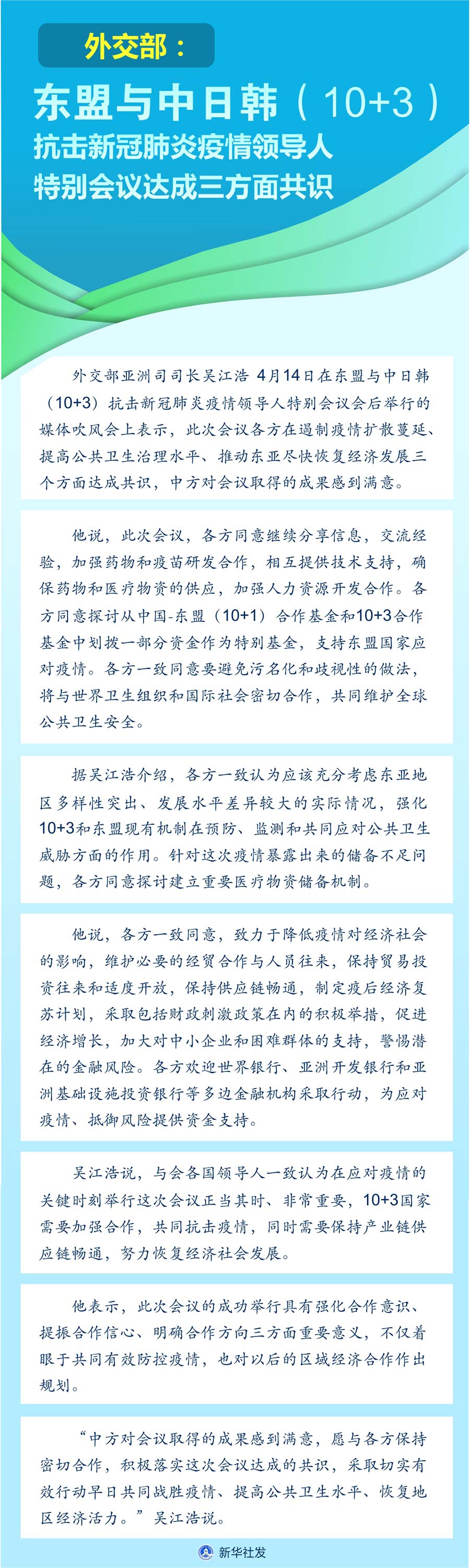 新華社北京4月14日電(記者伍岳)外交部亞洲司司長吳江浩14日在東盟與中日韓(10+3)抗擊新冠肺炎疫情領導人特別會議會后舉行的媒體吹風會上表示,此次會議各方在遏制疫情擴散蔓延、提高公共衛(wèi)生治理水平、推動東亞盡快恢復經(jīng)濟發(fā)展三個方面達成共識,中方對會議取得的成果感到滿意。