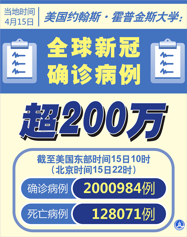 新華社紐約4月15日電 美國約翰斯·霍普金斯大學(xué)15日發(fā)布的新冠疫情最新統(tǒng)計(jì)數(shù)據(jù)顯示,截至美國東部時(shí)間15日10時(shí)(北京時(shí)間15日22時(shí)),全球新冠確診病例達(dá)2000984例,死亡病例為128071例。