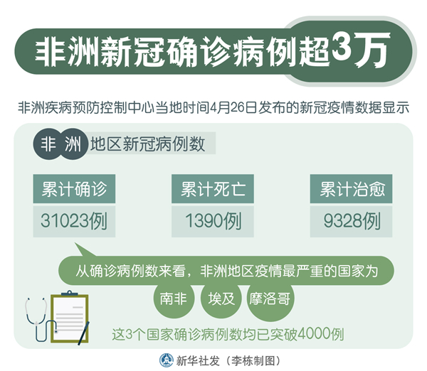 新華社達累斯薩拉姆4月26日電 綜合新華社駐非洲地區(qū)記者報道:非洲疾病預(yù)防控制中心26日發(fā)布的新冠疫情數(shù)據(jù)顯示,非洲地區(qū)新冠累計確診病例數(shù)為31023例,累計死亡1390例,累計治愈9328例。為支持非洲各國抗擊新冠疫情,聯(lián)合國推出信息平臺協(xié)助抗疫。