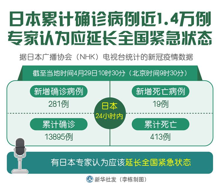 新華社東京4月29日電(記者華義)據(jù)日本廣播協(xié)會(huì)(NHK)電視臺(tái)統(tǒng)計(jì)的新冠疫情數(shù)據(jù),截至29日10時(shí)30分(北京時(shí)間9時(shí)30分),日本24小時(shí)內(nèi)新增確診病例281例,累計(jì)確診13895例;新增死亡病例19例,累計(jì)死亡413例。有日本專家認(rèn)為應(yīng)該延長全國緊急狀態(tài)。