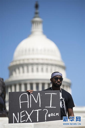5月30日,在美國首都華盛頓國會山附近,一名男子手持標語參加抗議活動。 新華社記者 劉杰 攝