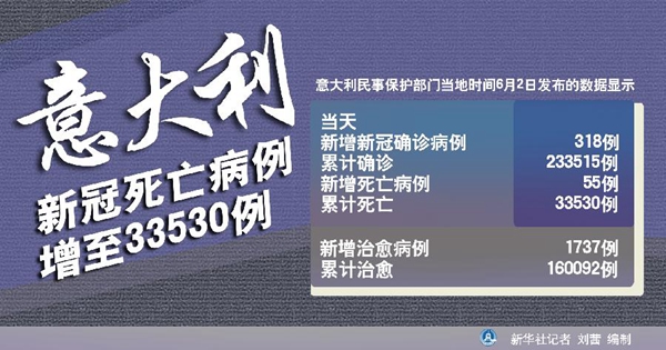 新華社羅馬6月2日電(記者陳占杰)意大利民事保護(hù)部門(mén)2日發(fā)布的數(shù)據(jù)顯示,該國(guó)當(dāng)天新增新冠確診病例318例,累計(jì)確診233515例;新增死亡病例55例,累計(jì)死亡33530例。