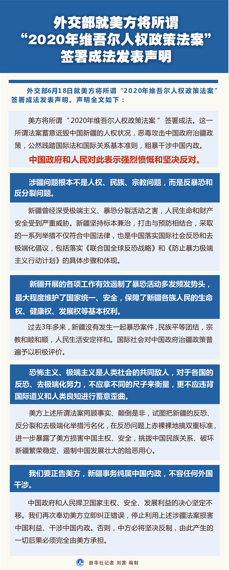 美方將所謂“2020年維吾爾人權(quán)政策法案”簽署成法。這一所謂法案蓄意詆毀中國新疆的人權(quán)狀況,惡毒攻擊中國政府治疆政策,公然踐踏國際法和國際關(guān)系基本準(zhǔn)則,粗暴干涉中國內(nèi)政。中國政府和人民對此表示強(qiáng)烈憤慨和堅(jiān)決反對。