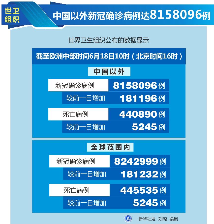 世衛(wèi)組織每日疫情報(bào)告顯示,截至歐洲中部時(shí)間18日10時(shí)(北京時(shí)間16時(shí)),中國(guó)以外新冠確診病例較前一日增加181196例,達(dá)到8158096例;中國(guó)以外死亡病例較前一日增加5245例,達(dá)到440890例。