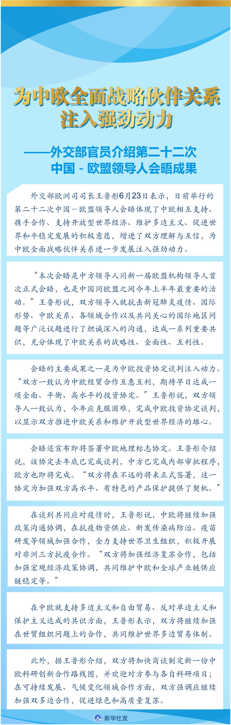 新華社北京6月23日電(記者王賓)外交部歐洲司司長王魯彤23日表示,日前舉行的第二十二次中國-歐盟領(lǐng)導(dǎo)人會(huì)晤體現(xiàn)了中歐相互支持、攜手合作、支持開放型世界經(jīng)濟(jì)、維護(hù)多邊主義、促進(jìn)世界和平穩(wěn)定發(fā)展的積極意愿,增進(jìn)了雙方理解與互信,為中歐全面戰(zhàn)略伙伴關(guān)系進(jìn)一步發(fā)展注入強(qiáng)勁動(dòng)力。