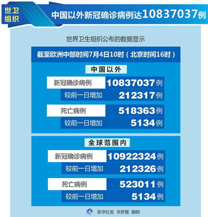 世衛(wèi)組織每日疫情報(bào)告顯示,截至歐洲中部時(shí)間4日10時(shí)(北京時(shí)間16時(shí)),中國(guó)以外新冠確診病例較前一日增加212317例,達(dá)到10837037例;中國(guó)以外死亡病例較前一日增加5134例,達(dá)到518363例。