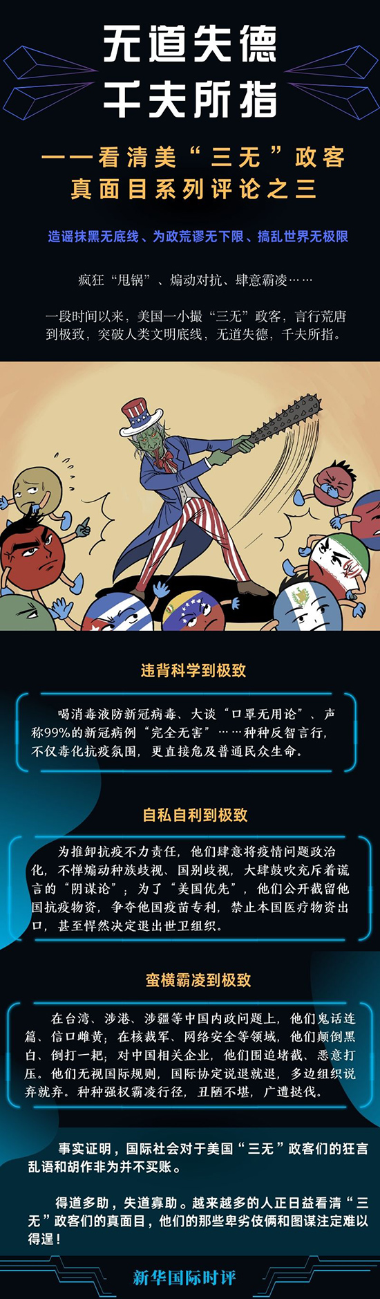 瘋狂“甩鍋”、煽動(dòng)對(duì)抗、肆意霸凌……一段時(shí)間以來(lái),美國(guó)一小撮造謠抹黑無(wú)底線、為政荒謬無(wú)下限、搞亂世界無(wú)極限的“三無(wú)”政客,言行荒唐到極致,突破人類文明底線,無(wú)道失德,千夫所指。