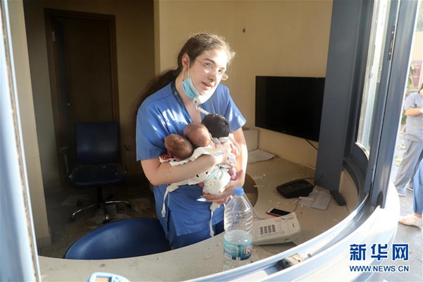 8月4日,在黎巴嫩首都貝魯特,一名護士在受損的醫(yī)院內照料三名嬰兒。新華社發(fā)(比拉爾·賈維希攝)