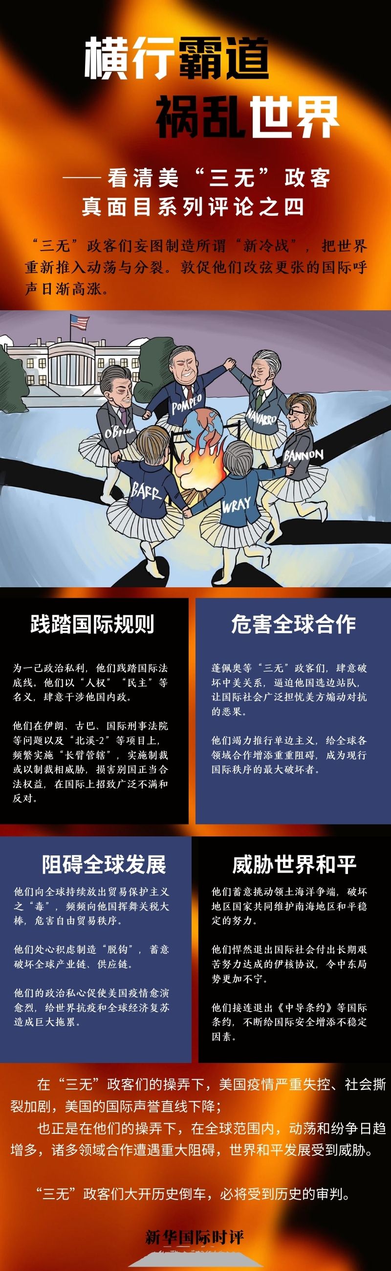 “三無”政客們的亂言與惡行,正在美國和國際上造成種種惡果。正是在他們的操弄下,美國疫情嚴(yán)重失控、社會撕裂加劇,美國的國際聲譽(yù)直線下降;也正是在他們的操弄下,在全球范圍內(nèi),動蕩和紛爭日趨增多,諸多領(lǐng)域合作遭遇重大阻礙,世界和平發(fā)展受到威脅?!叭裏o”政客們大開歷史倒車,必將受到歷史的審判。