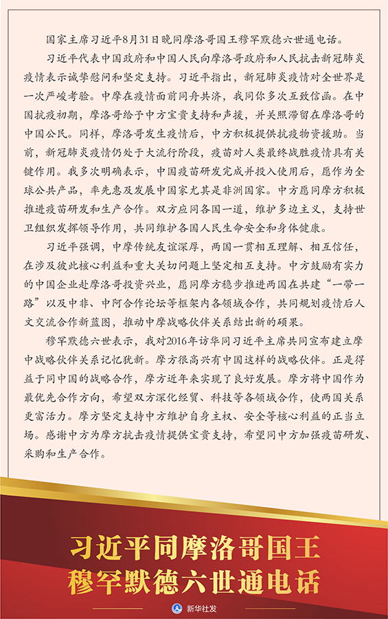 習(xí)近平代表中國政府和中國人民向摩洛哥政府和人民抗擊新冠肺炎疫情表示誠摯慰問和堅定支持。習(xí)近平指出,新冠肺炎疫情對全世界是一次嚴峻考驗。中摩在疫情面前同舟共濟,我同你多次互致信函。在中國抗疫初期,摩洛哥給予中方寶貴支持和聲援,并關(guān)照滯留在摩洛哥的中國公民。同樣,摩洛哥發(fā)生疫情后,中方積極提供抗疫物資援助。當前,新冠肺炎疫情仍處于大流行階段,疫苗對人類最終戰(zhàn)勝疫情具有關(guān)鍵作用。我多次明確表示,中國疫苗研發(fā)完成并投入使用后,愿作為全球公共產(chǎn)品,率先惠及發(fā)展中國家尤其是非洲國家。中方愿同摩方積極推進疫苗研發(fā)和生產(chǎn)合作。雙方應(yīng)同各國一道,維護多邊主義,支持世衛(wèi)組織發(fā)揮領(lǐng)導(dǎo)作用,共同維護各國人民生命安全和身體健康。