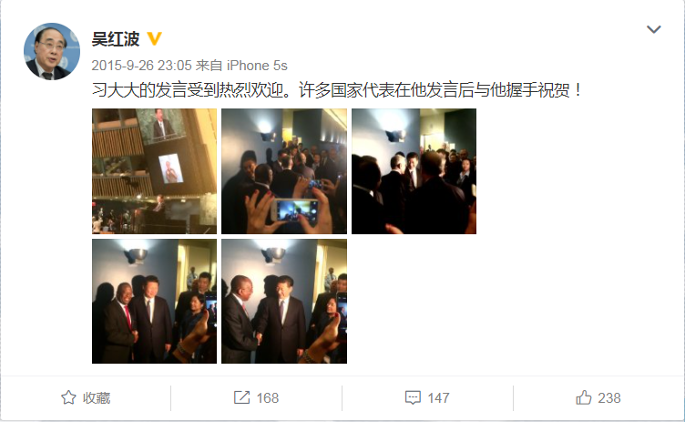 時(shí)任聯(lián)合國(guó)副秘書(shū)長(zhǎng)吳紅波說(shuō),習(xí)主席走下講臺(tái)時(shí),二三十位其他國(guó)家領(lǐng)導(dǎo)人排隊(duì)與他握手表示祝賀,走廊里擠得滿滿當(dāng)當(dāng)。