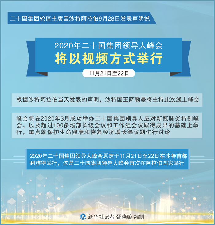 根據(jù)沙特阿拉伯當天發(fā)表的聲明,沙特國王薩勒曼將主持此次線上峰會。峰會將在今年3月成功舉辦二十國集團領導人應對新冠肺炎特別峰會,以及超過100多場部長級會議和工作組會議取得成果的基礎上舉行,重點就保護生命健康和恢復經(jīng)濟增長等議題進行討論。
