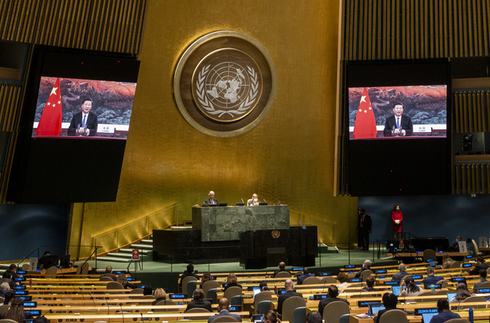 9月22日,國家主席習(xí)近平在第七十五屆聯(lián)合國大會(huì)一般性辯論上發(fā)表重要講話。新華社發(fā)(聯(lián)合國供圖/埃瑟金德爾·德貝貝 攝)