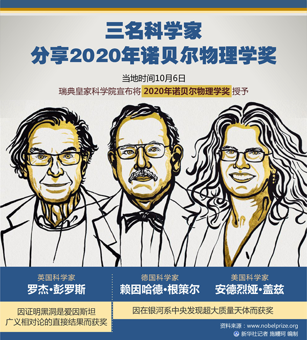 新華社斯德哥爾摩10月6日電(記者和苗 付一鳴)瑞典皇家科學(xué)院6日宣布,將2020年諾貝爾物理學(xué)獎(jiǎng)授予三名科學(xué)家。英國(guó)科學(xué)家羅杰·彭羅斯因證明黑洞是愛(ài)因斯坦廣義相對(duì)論的直接結(jié)果而獲獎(jiǎng);德國(guó)科學(xué)家賴因哈德·根策爾和美國(guó)科學(xué)家安德烈婭·蓋茲因在銀河系中央發(fā)現(xiàn)超大質(zhì)量天體而獲獎(jiǎng)。
