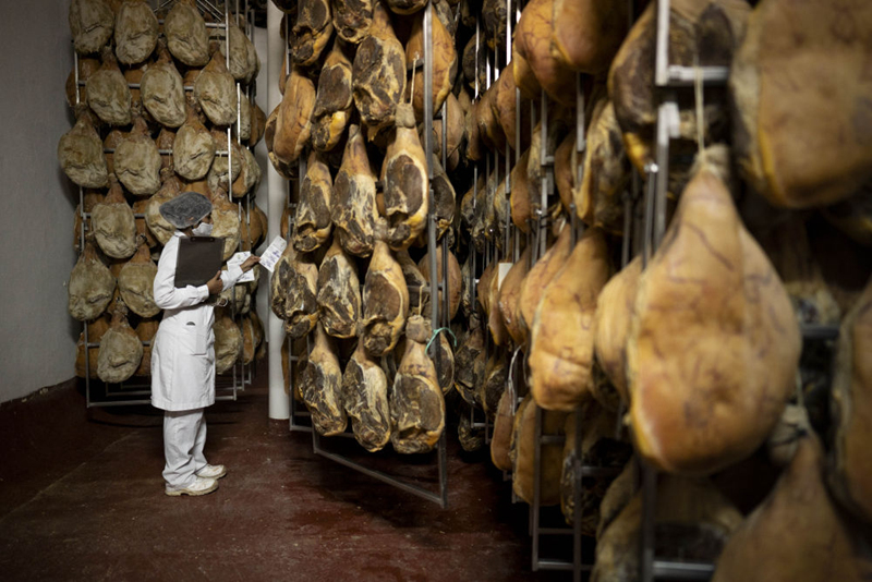 10月28日,在阿根廷首都布宜諾斯艾利斯附近的馬科斯·帕斯,一名工人檢查火腿的制作情況。這座人口僅有6萬多人的小鎮(zhèn)以城市之名報名參加第三屆進博會。新華社發(fā)(馬丁·薩巴拉攝)