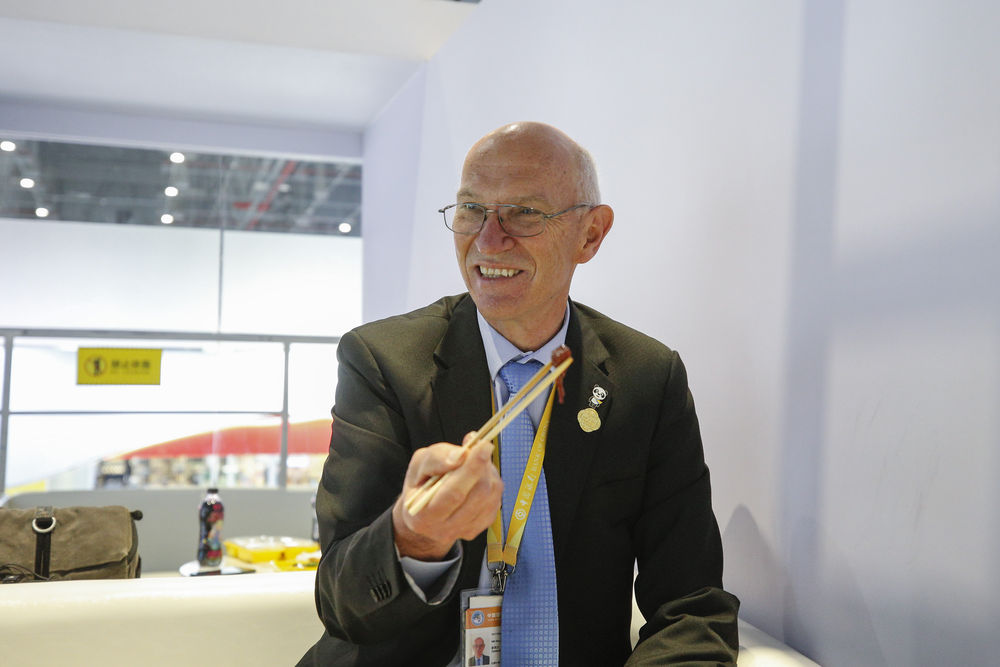 11月7日,午休時(shí),羅伊在第三屆進(jìn)博會(huì)紐仕蘭乳業(yè)展臺(tái)使用筷子吃飯。