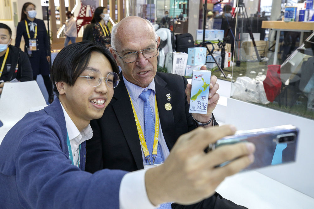 11月7日,羅伊(右)在第三屆進(jìn)博會(huì)紐仕蘭乳業(yè)展臺(tái)和粉絲合影。