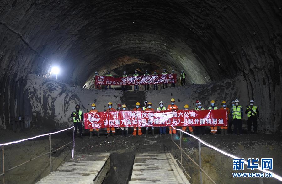 11月15日,施工人員在印度尼西亞西爪哇省慶祝雅萬(wàn)高鐵7號(hào)隧道貫通。新華社發(fā)(祖卡南 攝)