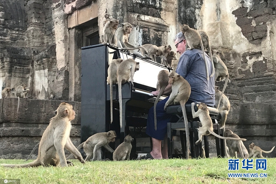 11月21日,泰國華富里府,英國鋼琴家保羅·巴頓(Paul Barton)為一群猴子彈鋼琴。演奏過程中,多只猴子在他周圍跑來跑去,有幾只還爬上了鋼琴,甚至在他的頭頂跳來跳去。巴頓稱,這場特殊的音樂會旨在引起人們對這群饑餓的猴子的重視。(圖片來源:東方IC)