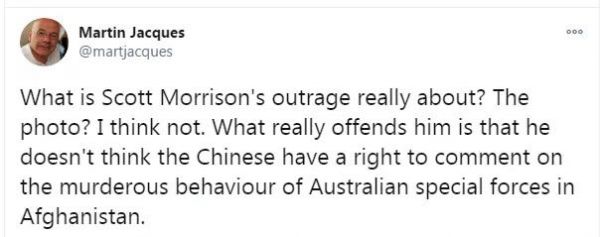 “莫里森的憤怒到底是什么?‘照片’?我想不是。真正令他惱怒的是,他認為中國人無權對澳大利亞特種部隊在阿富汗的謀殺行為發(fā)表評論。”