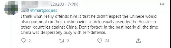 在這條推特下邊,許多網(wǎng)友為馬丁·雅克點贊。其中一位網(wǎng)友說道:“我認為真正讓他惱火的是,他沒想到中國人也會對他們的不當行為發(fā)表評論,這是澳大利亞人和其他國家對付中國的慣用伎倆。別忘了,在過去幾乎所有的時間里,中國都在拼命地進行自衛(wèi)?!?/p>