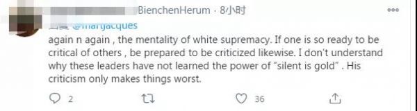 “又一次,白人至上的心態(tài)。如果一個人準備好批評別人,也要準備好同樣地被批評。我不明白為什么這些領導人沒有學會‘沉默就是金子’的力量。他的批評只會讓事情變得更糟?!?/font>