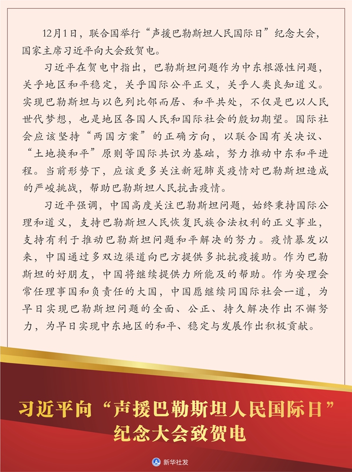 新華社北京12月2日電? 12月1日,聯(lián)合國舉行“聲援巴勒斯坦人民國際日”紀念大會,國家主席習近平向大會致賀電。