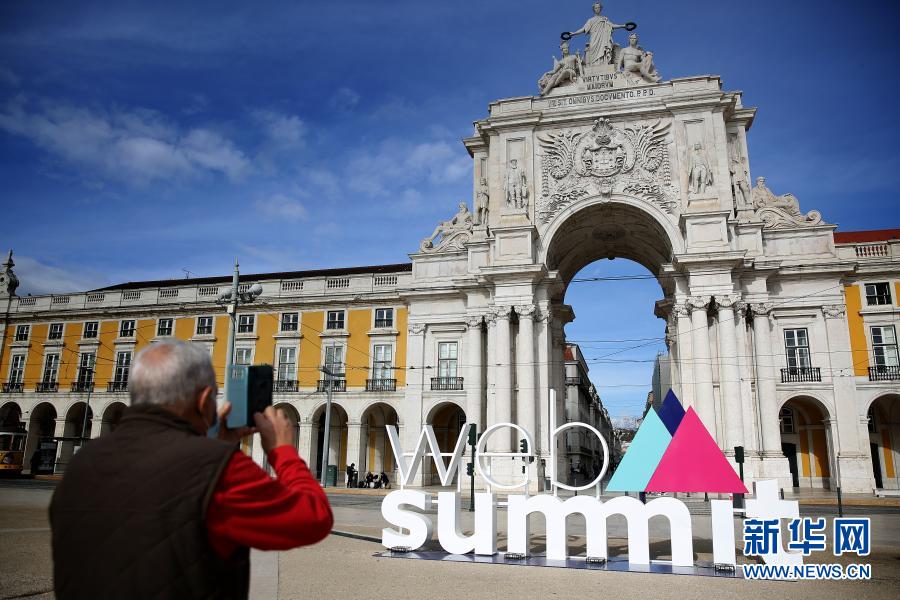 11月30日,在葡萄牙里斯本,一名男子用手機(jī)拍攝2020年網(wǎng)絡(luò)峰會(huì)的立體標(biāo)識(shí)。