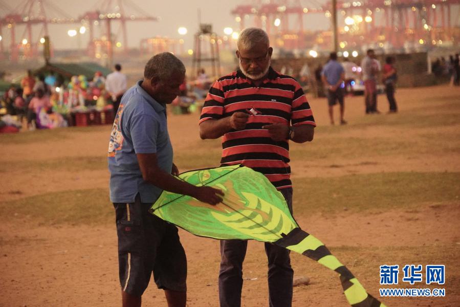 這張拍攝于2019年1月10日的資料照片顯示,納瓦(左)在斯里蘭卡首都科倫坡加勒菲斯綠地廣場(chǎng)上幫助一名游客調(diào)整風(fēng)箏。新華社記者 唐璐 攝