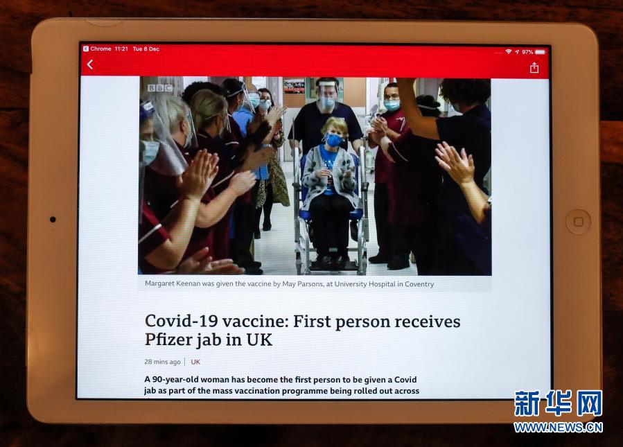 12月8日在英國倫敦拍攝的播放新聞的電腦屏幕顯示,醫(yī)護人員為該國首位接種新冠疫苗的90歲女子瑪格麗特·基南鼓掌。